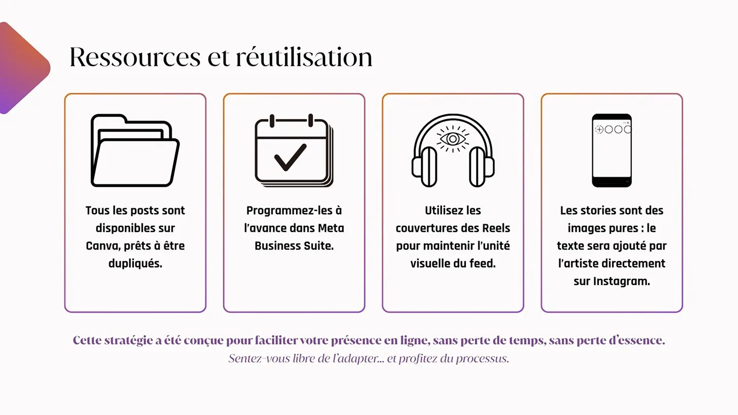 Un feed harmonisé : une grille professionnelle de 9 publications prêtes à l’emploi et alignées sur votre univers artistique.